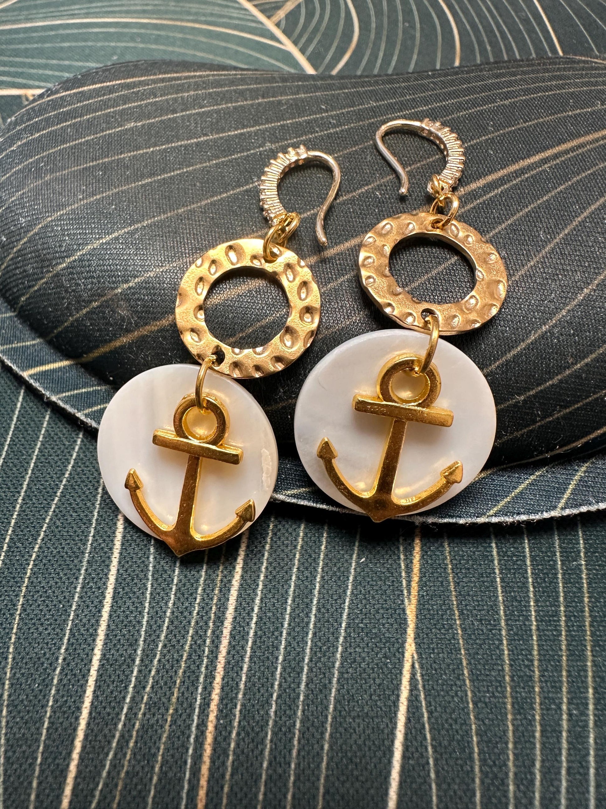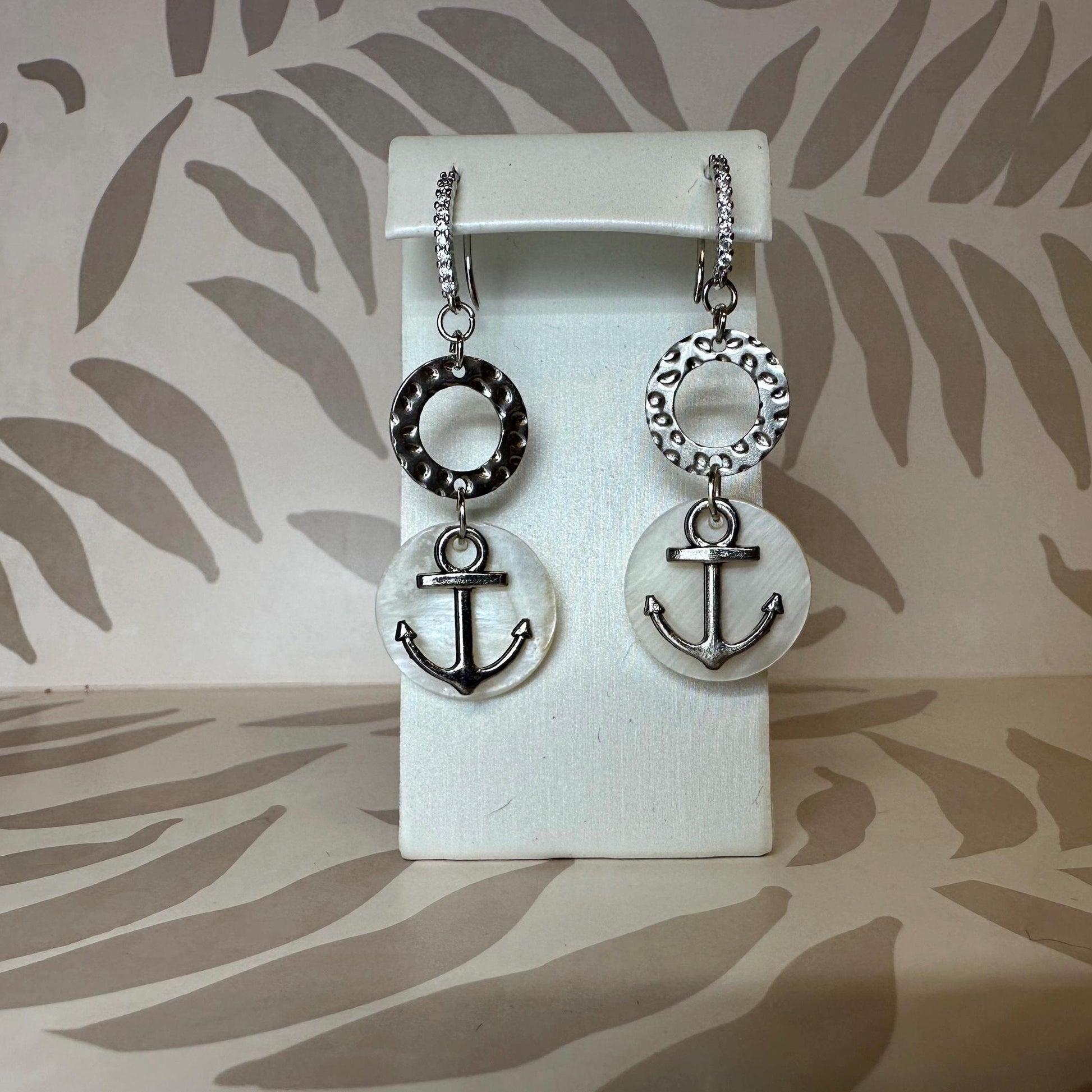 Handmade earrings with natural seashell and anchor charms and cubic zirconia accents