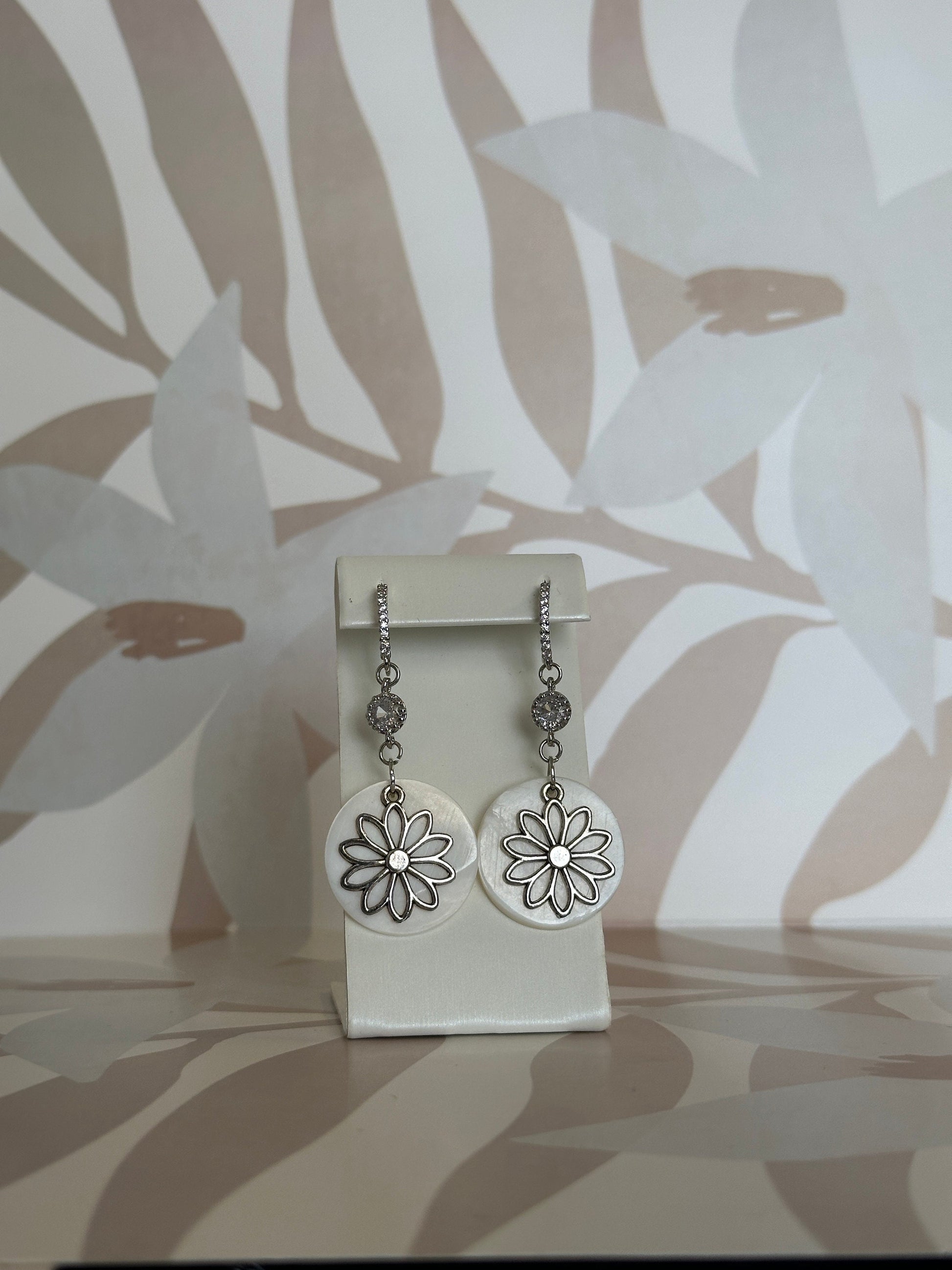 Handmade earrings with natural seashell, flower charms and cubic zirconia accents