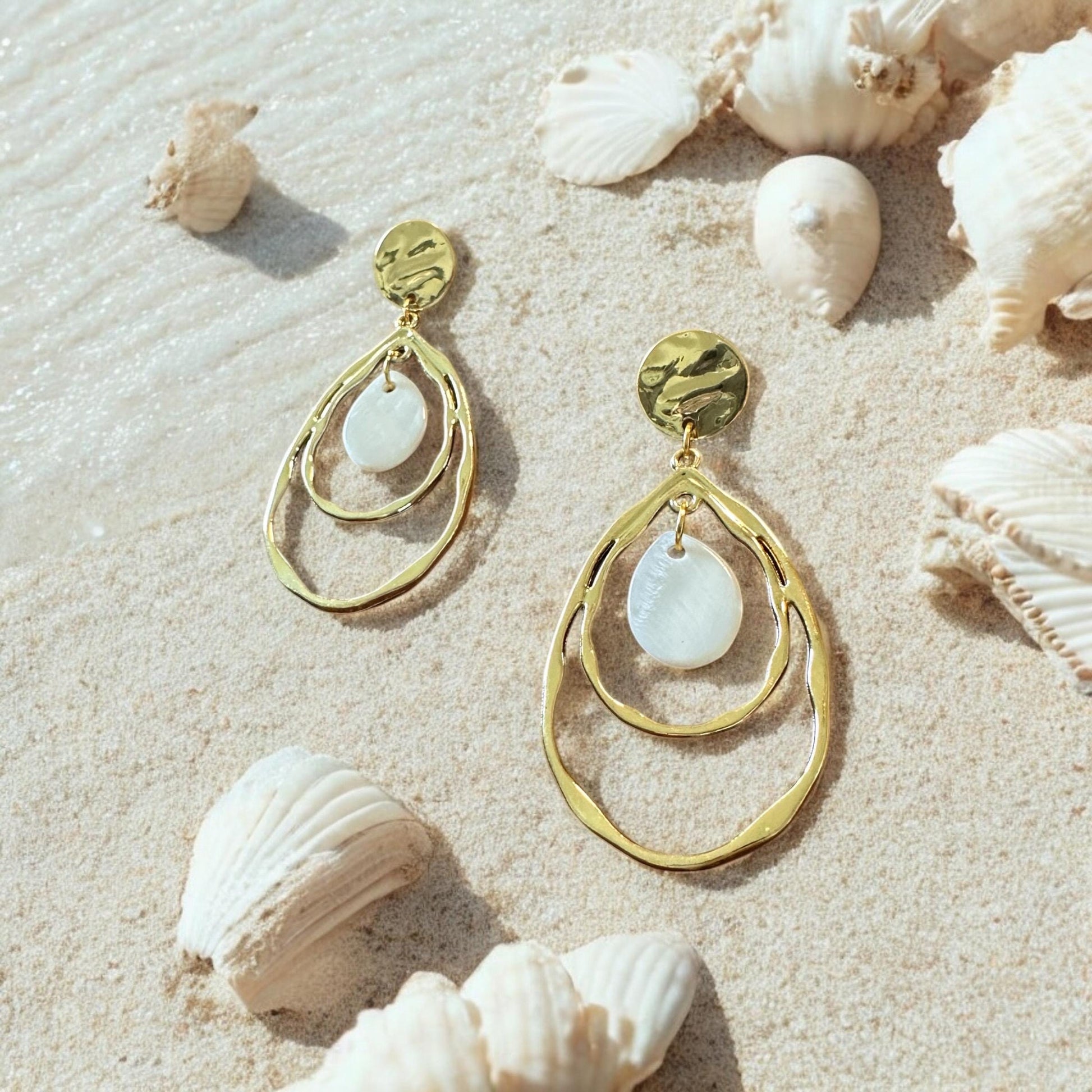 Hammered Teardrops and Natural Seashell Handmade Earrings; Beach, Ocean, Vacation, Sun, Cruise Accessories and Jewelry - Shella Bella