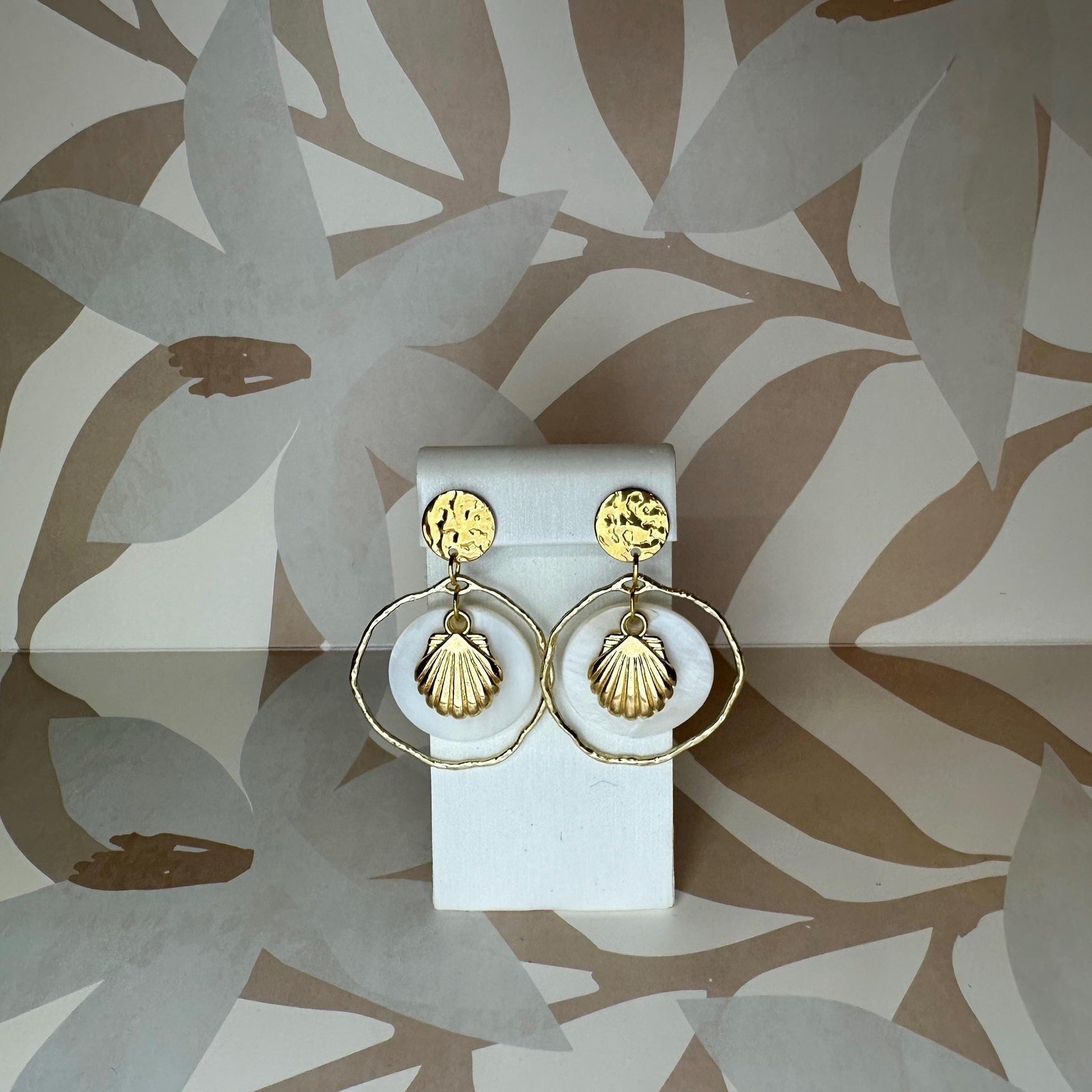 Handmade earrings with natural seashell, scallop charms and gold tone hammered accents
