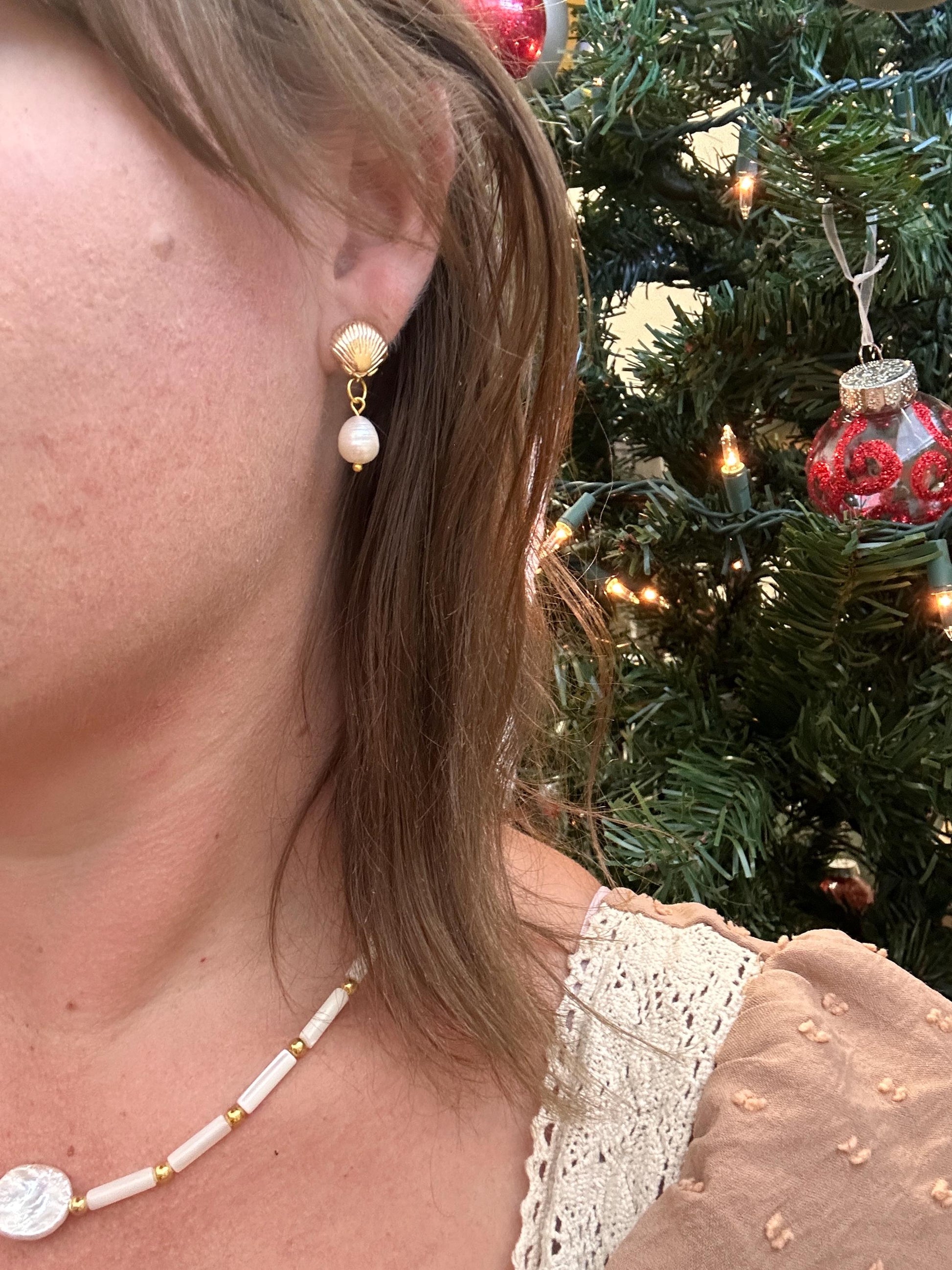 Seashell and Pearl Drop Handmade Earrings; Beach, Ocean, Vacation, Sun, Cruise Accessories and Jewelry - Shella Bella